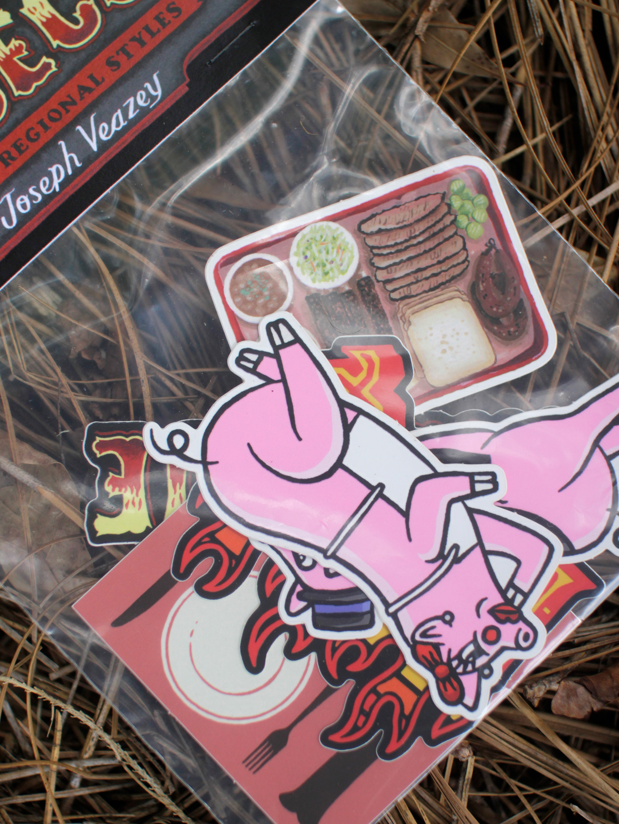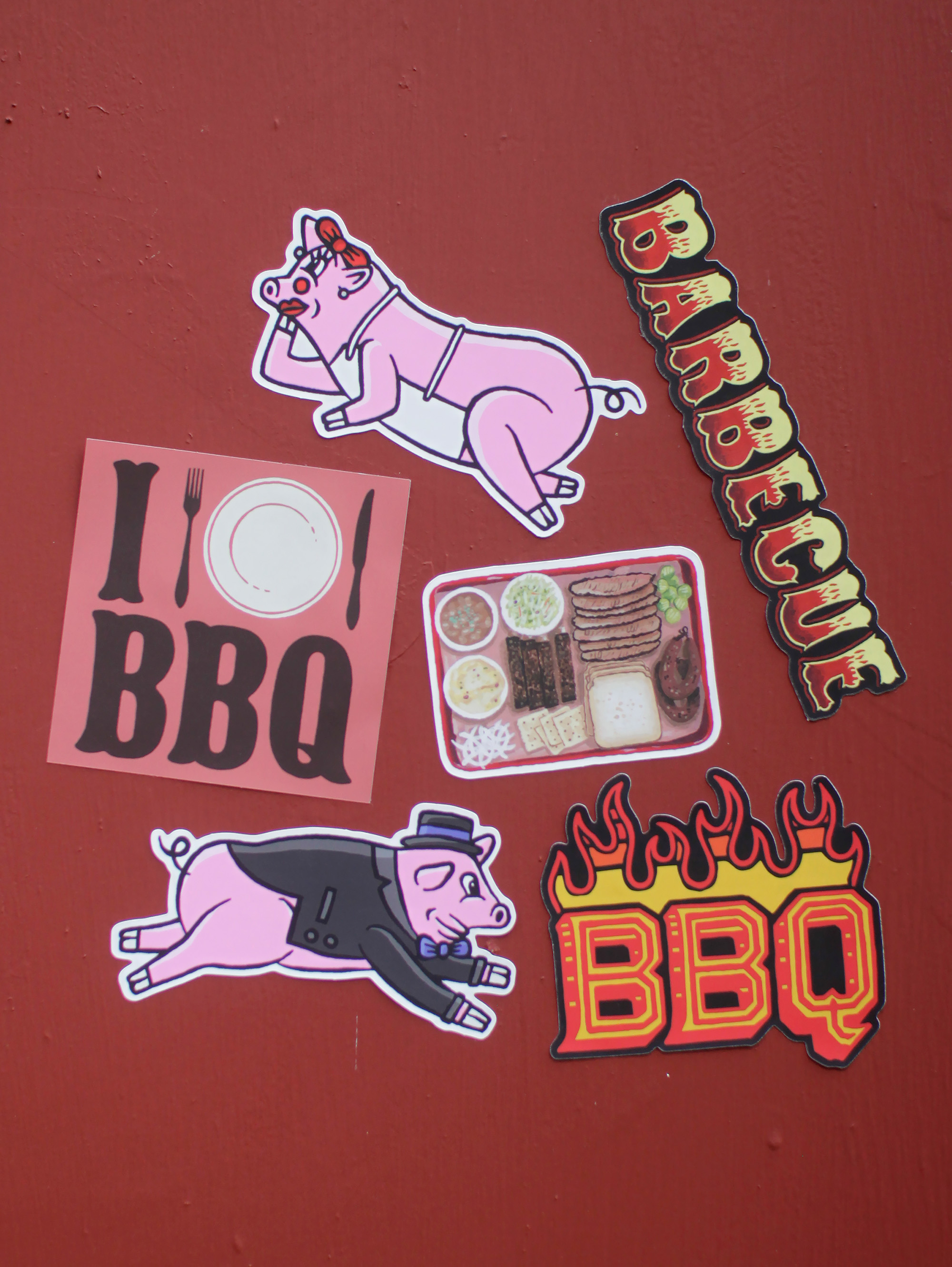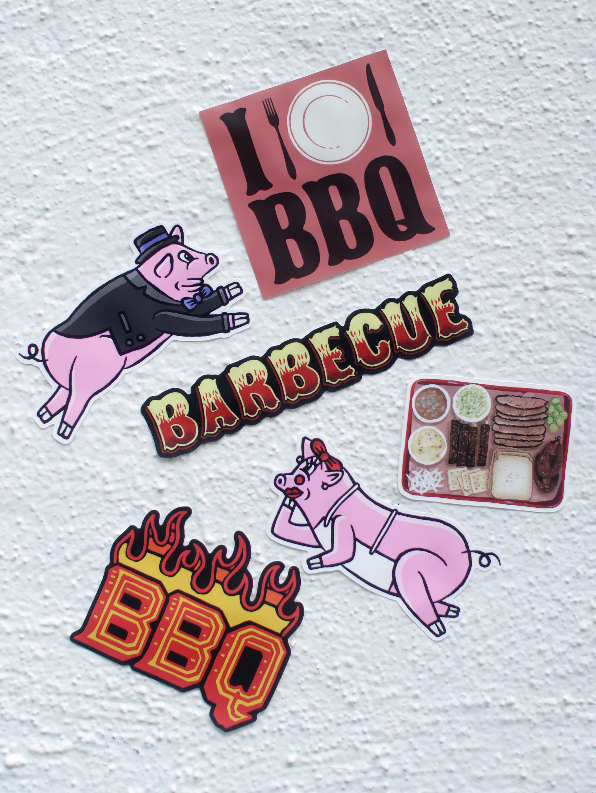 High quality full-color vinyl stickers. The art features paintings of a Texas Barbecue tray and "BARBECUE" lettering from the American Barbecue Map, "I EAT BBQ," "BBQ" on fire, and male and female barbecue pig cartoons. Stickers come in a poly sleeve with a printed header card. Ready to be applied to your laptop, bike, water bottle, journal, etc.! Sticker sizes are as follows: Texas Barbecue Tray: 2.5" x 1.75" "BARBECUE" Lettering: 4.75" x 1" "I EAT BBQ": 2.75" x 2.75" "BBQ" on Fire: 3" x 2.75" Male Barbecue Pig Cartoon: 3.5" x 2" Female Barbecue Pig Cartoon: 3.5" x 2"