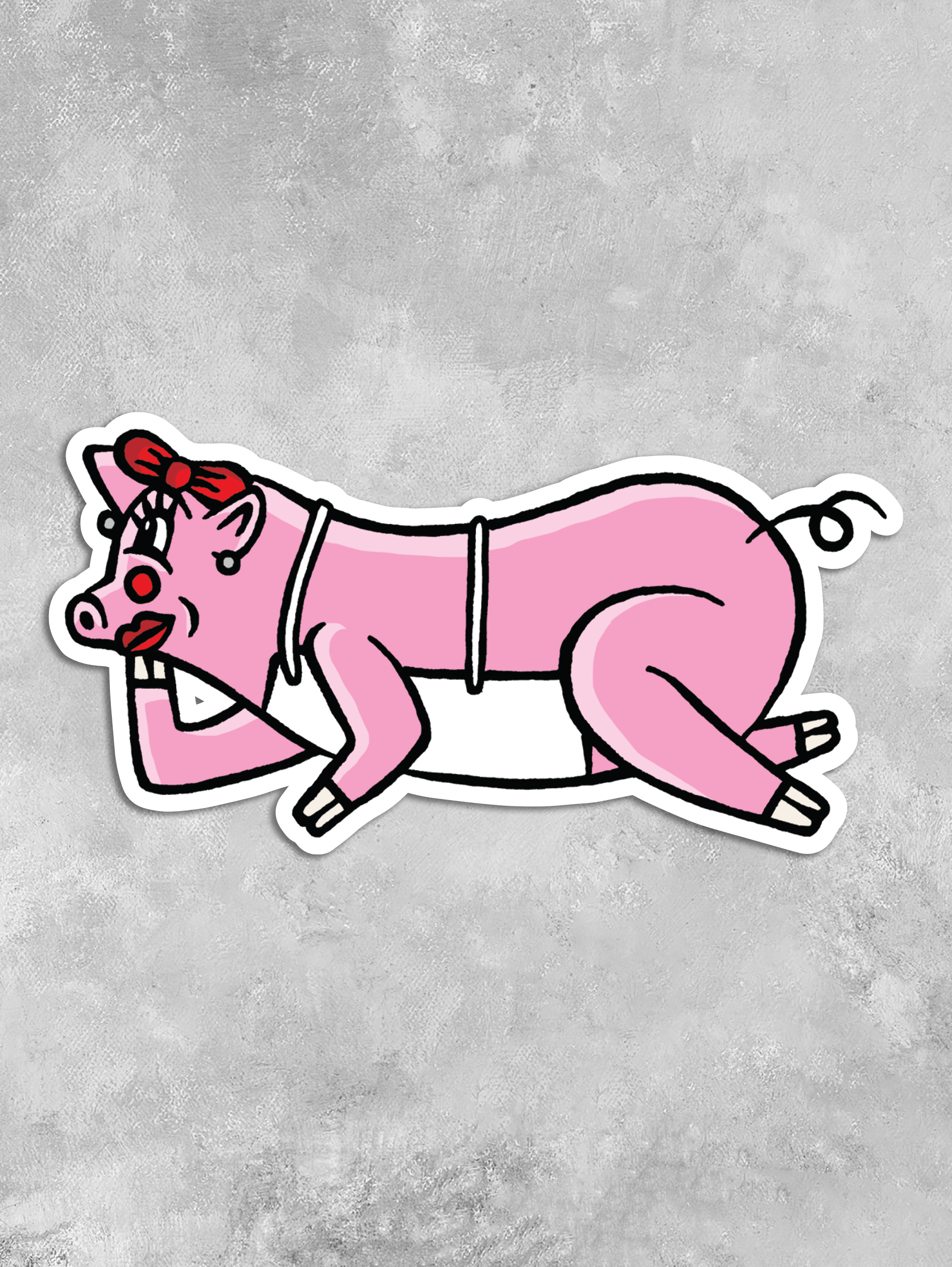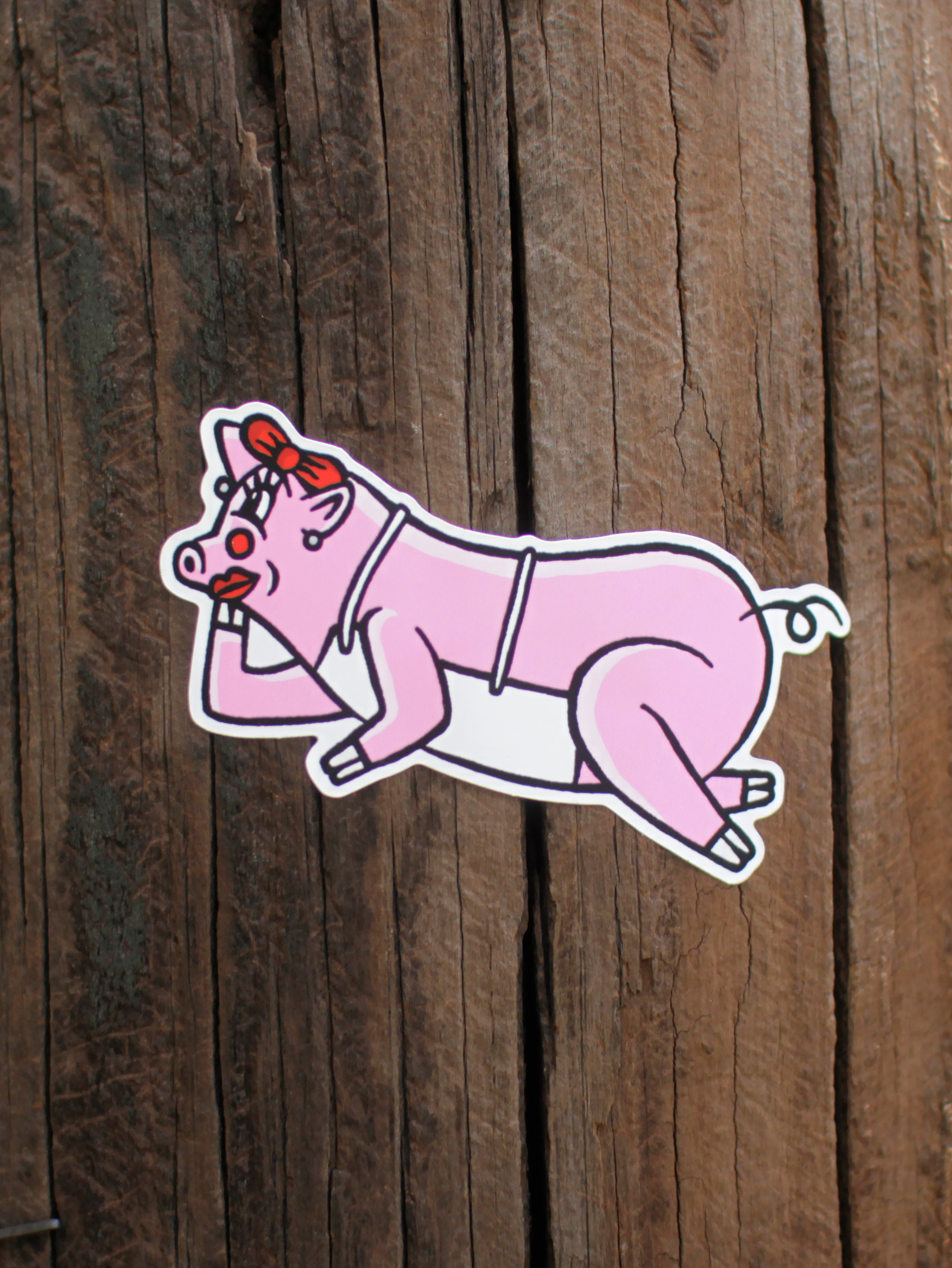 High quality 3.5" x 2" full-color vinyl sticker. The art features original art/illustration of the female pig cartoon from the American Barbecue Map. Ready to be applied to your laptop, bike, water bottle, journal, etc.!