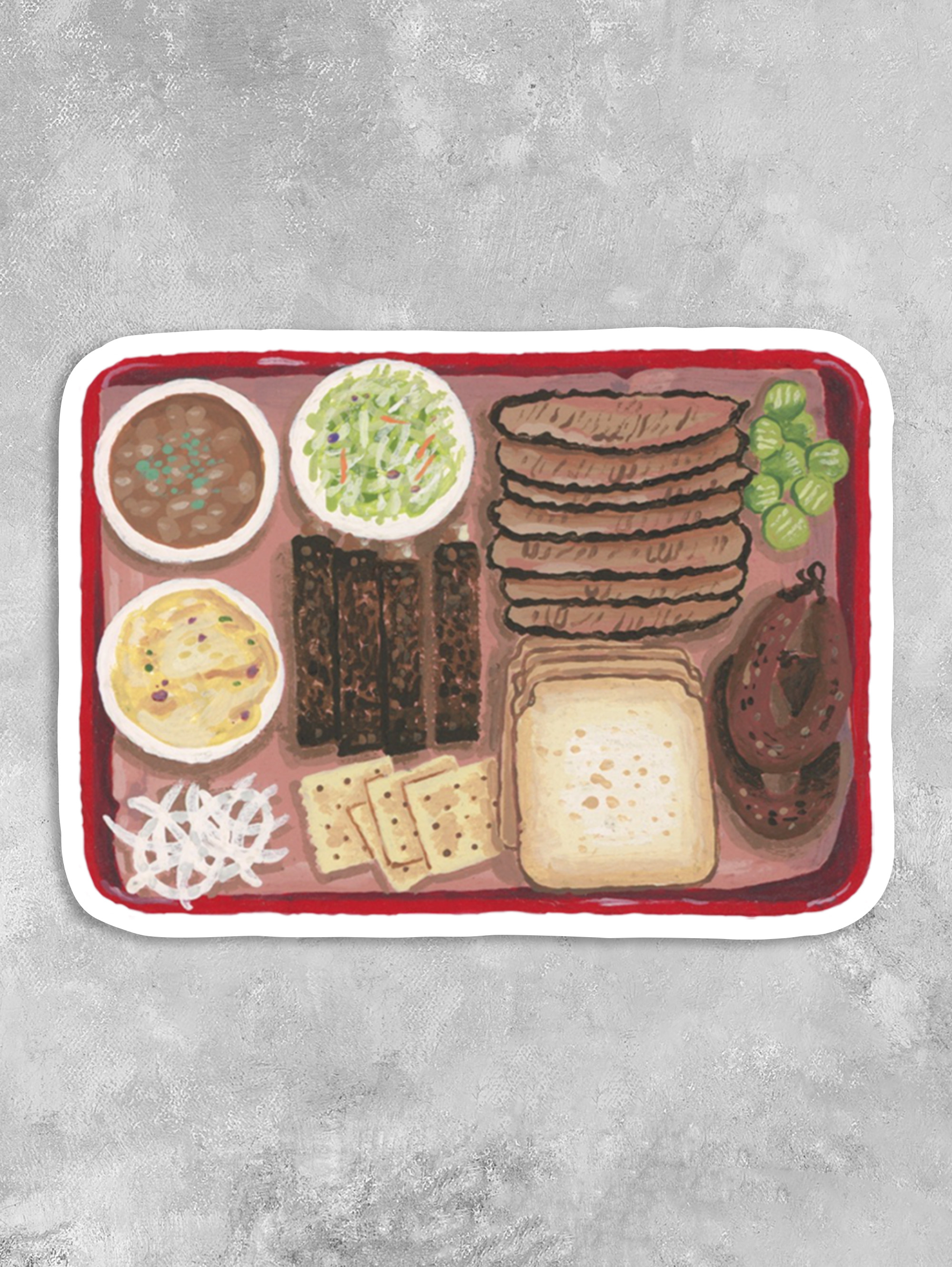 High quality 2.5" x 1.75" full-color vinyl sticker. The art features original art/painting of a signature Texas tray of barbecue, as featured on the American Barbecue Map. Ready to be applied to your laptop, bike, water bottle, journal, etc.!
